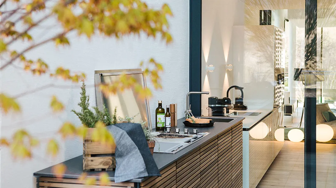 Each CUBIC OUTDOOR CABINET is unique – none looks like the other. But you have to start at some point. First of all, we use our special weatherproof CUBIC material, which forms the carcass of the outdoor kitchen. This carcass can be varnished in every color you wish. For orientation, we offer 10 standard colors. Additionally, we cover the CUBIC OUTDOOR CABINETS with wooden slats for a more natural look. Here you can choose from larch, sipo mahogany or our heat-treated Lignum-T, which are perfectly suitable for outdoor use. Also, the choice of the right location is key: Where should your CUBIC OUTDOOR CABINETS be located? What is the surface like? What shape should the kitchen be? Will it stand against a wall or is it freely accessible from all sides? The right location for an outdoor kitchen depends on your needs and preferences. Perhaps you prefer a freestanding kitchen in the middle of nature. Or you may prefer to grill directly on the terrace to benefit from short distances. We will be happy to advise you and to find the optimal design compatible to your outdoor area.